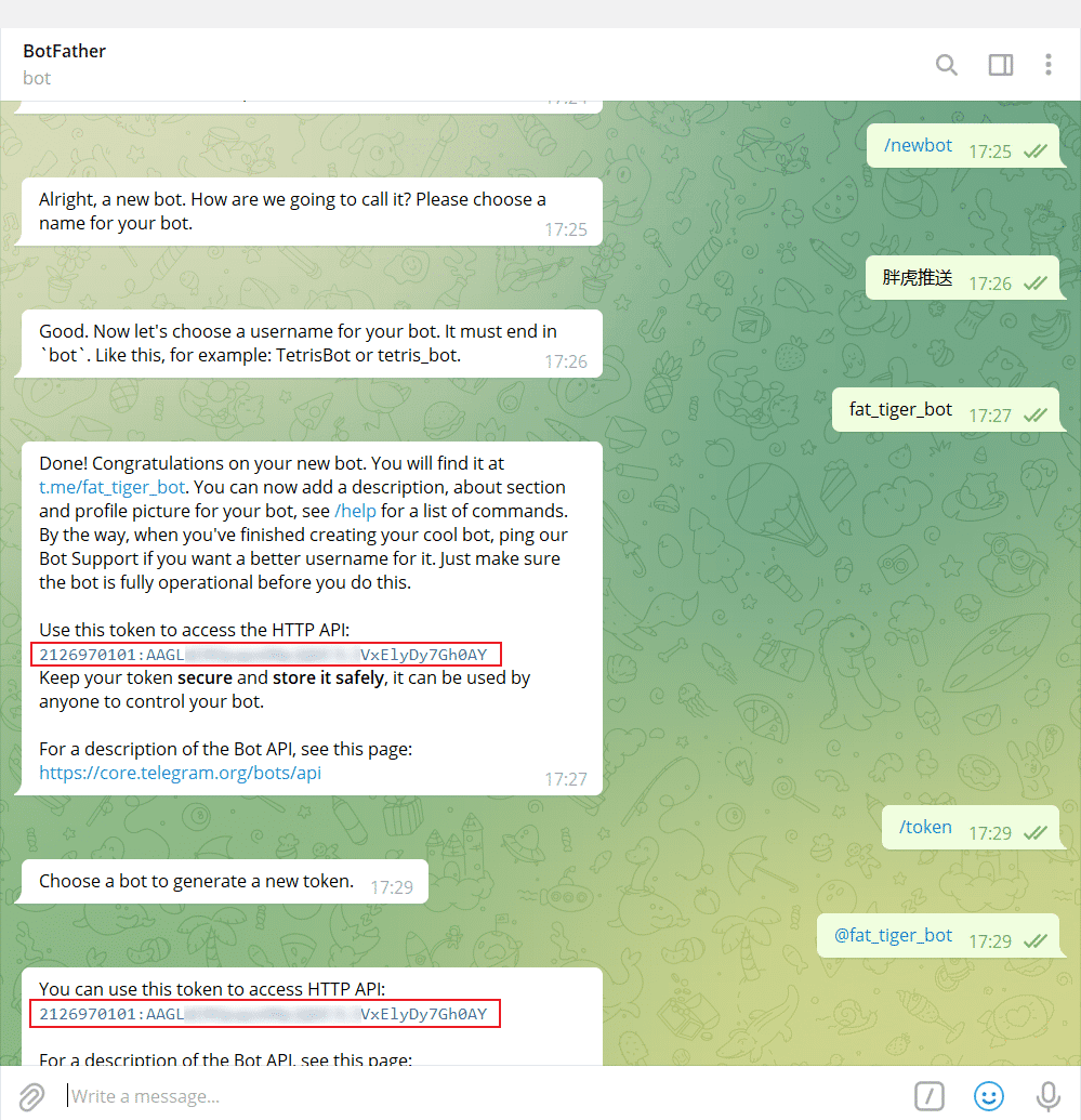 5、发送/newbot给@BotFather,然后根据提示创建,创建完成后根据图示操作获取token